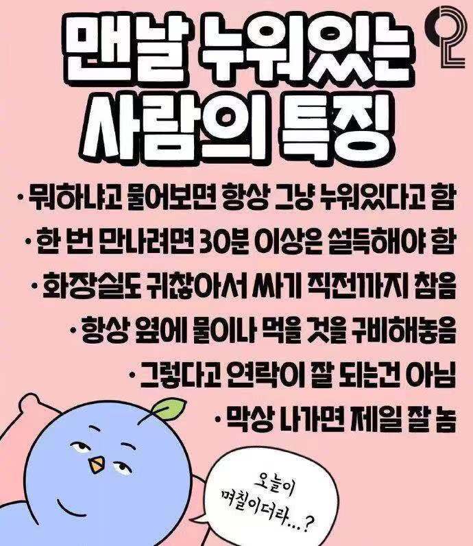 整天躺着的人的特征:1️·问他在干什么呢,总是会回答说在躺着2️·想见他一次,起码要说服30分钟以上3️·去上厕所也嫌麻烦,一定要憋到