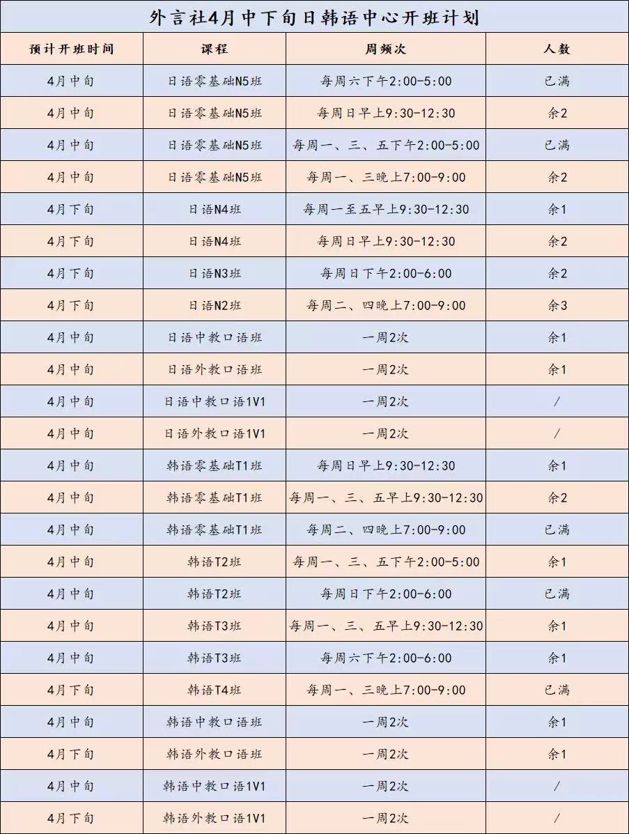 外言社4月中下旬日韩语开班计划新鲜出炉~名额有限,有跟班计划的同学们及时跟教务老师联系哦!