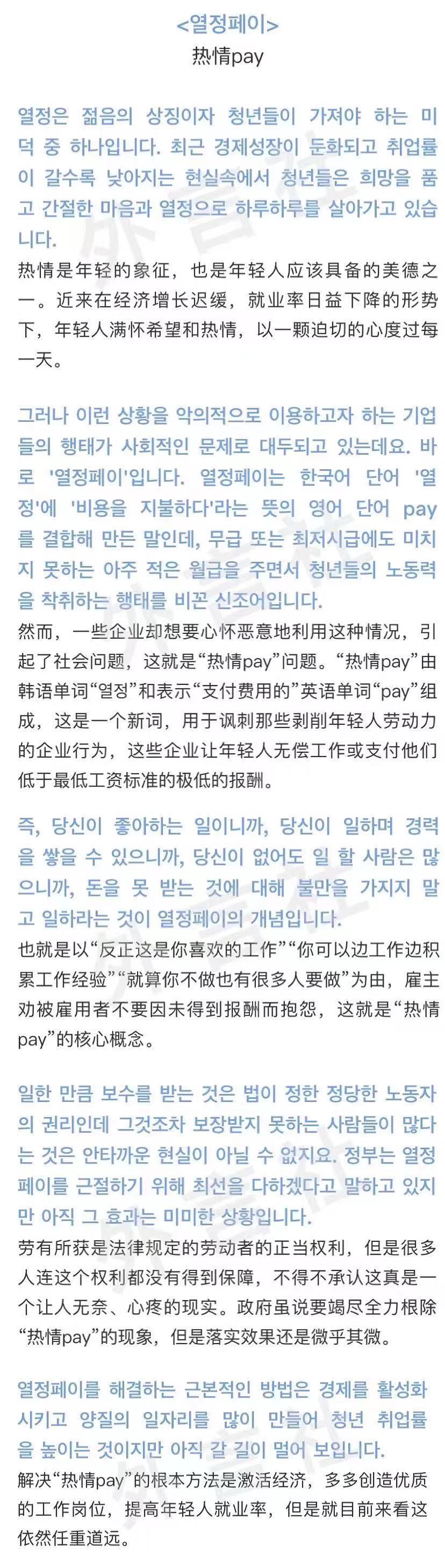 在社会经济增长迟缓,就业率日益下降的形势下韩国年轻人的就业问题也不断凸显,近年来还出现了热情pay现象️什么是热情pay呢?一起来看看吧~