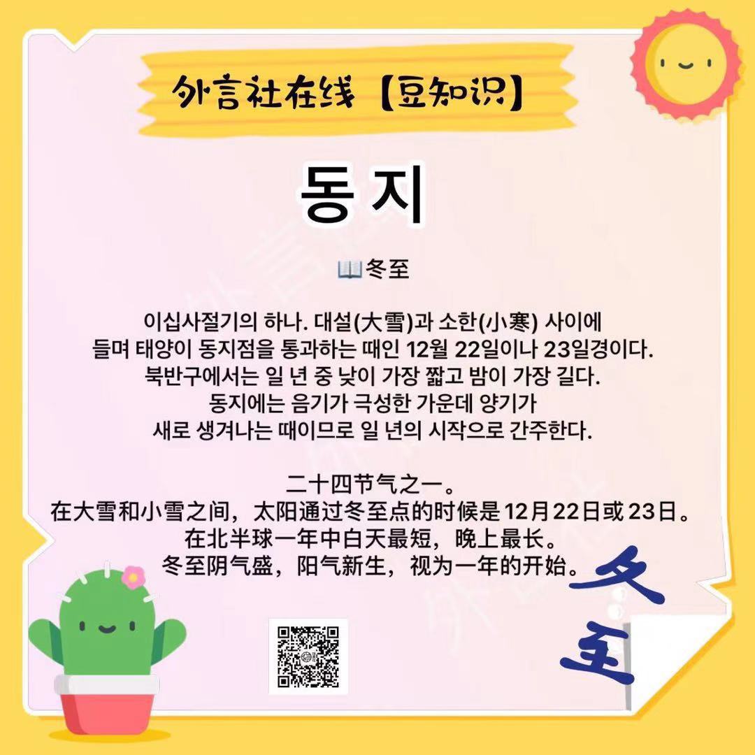 大家了解了日语「冬至」的说法,那用韩语应该怎么表达「冬至」呢?一起来看看吧~PS:今天大家是准备吃汤圆?吃饺子?还是喝羊肉汤呢?