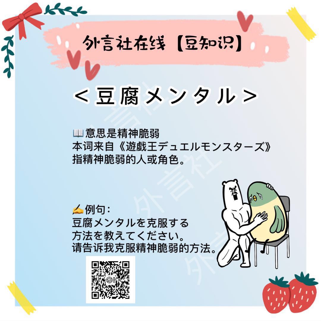 「メンタル」是英语 mental ️意思是心理(的),精神(的),智力(的)「豆腐メンタル」则是指心理或精神状态像豆腐一样脆弱的人或角色。