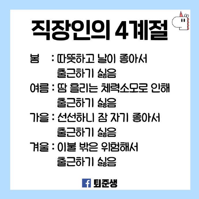 上班族们的四季:春天:温暖,天气好,所以不想上班夏天:流汗,消耗体力,所以不想上班秋天:天气清爽,适合睡觉,所以不想上班冬天:被子