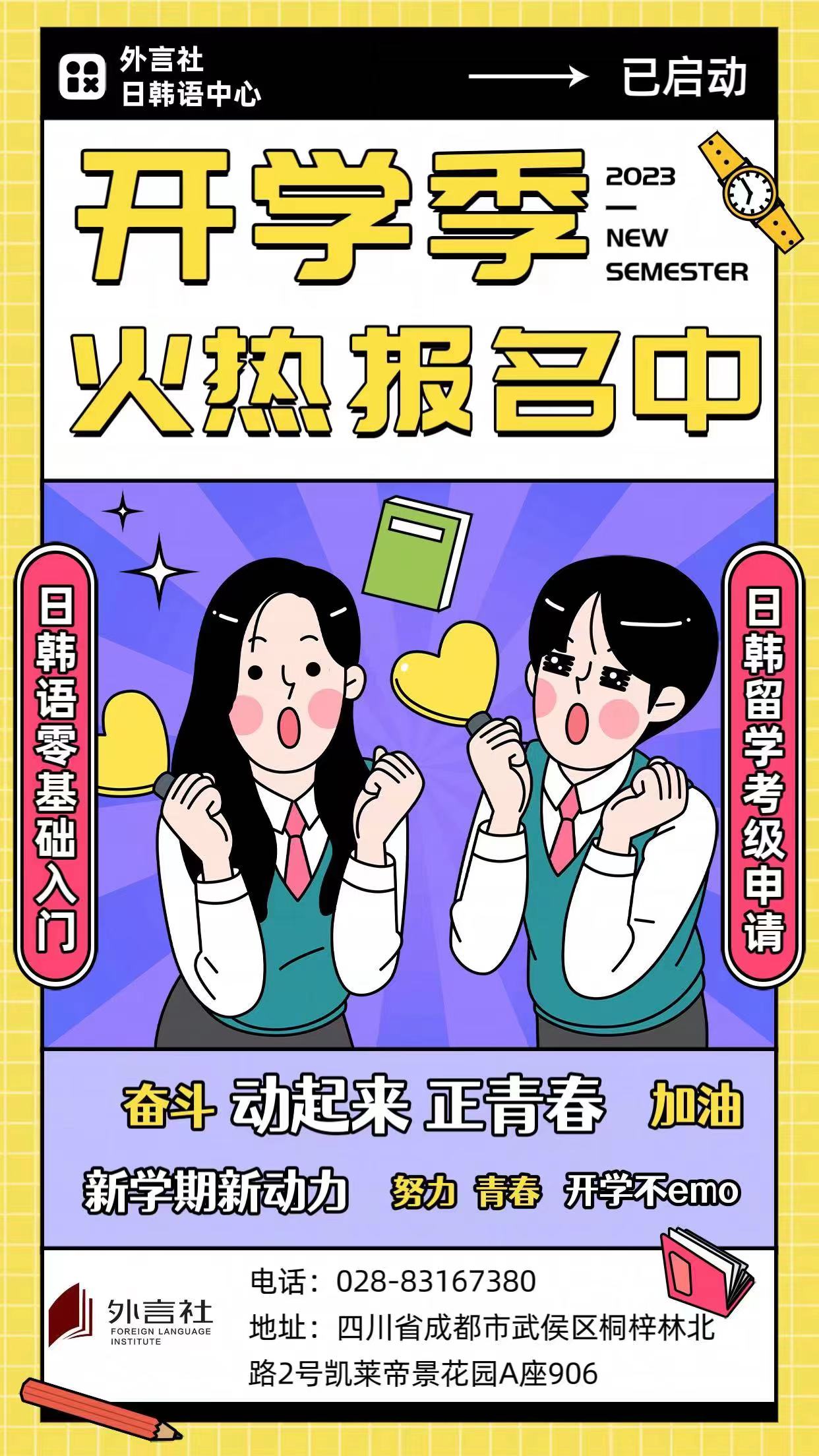 外言社开学季来啦!新班火热报名中 新生特惠享不停~日韩语零基础至中高级课程应有尽有。白班、晚班、周末班等各类班型总有一款适合你!新