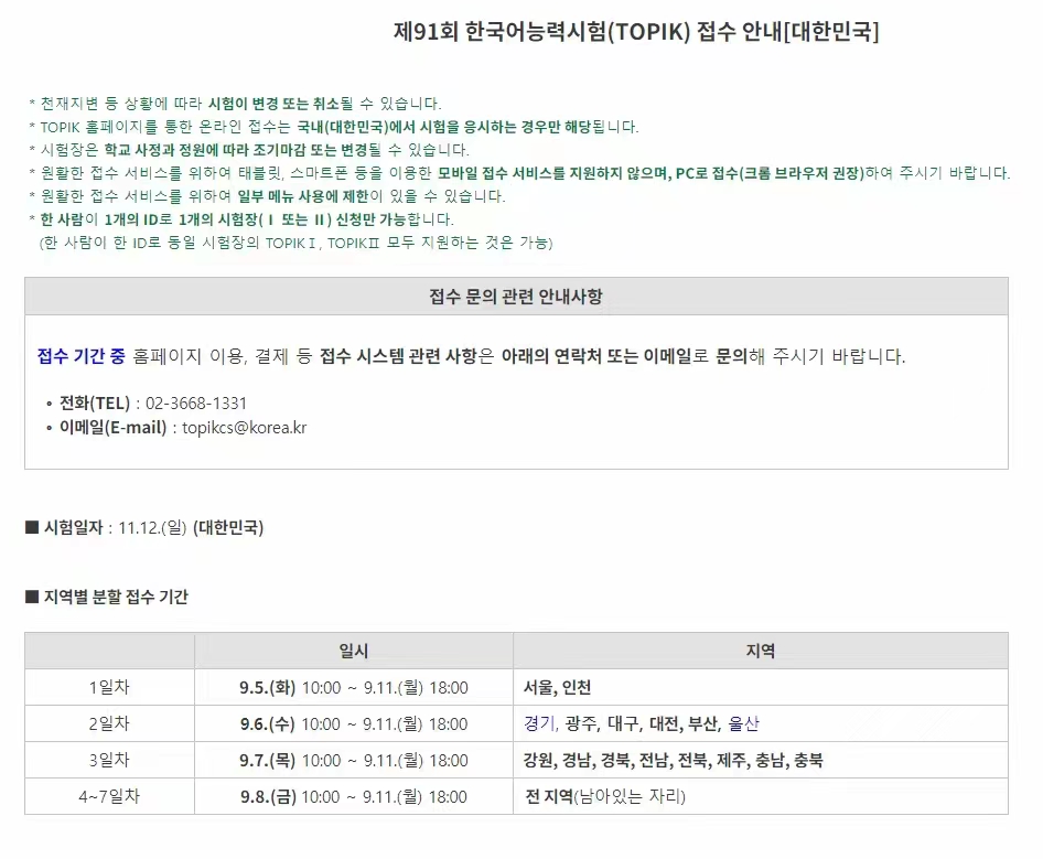 需要报名韩国11月TOPIK考试的同学 看过来报名时间首尔、仁川:09 05-09 11京畿、光州、大邱、大田、釜山、蔚山:09 06-09 11江原、庆南、