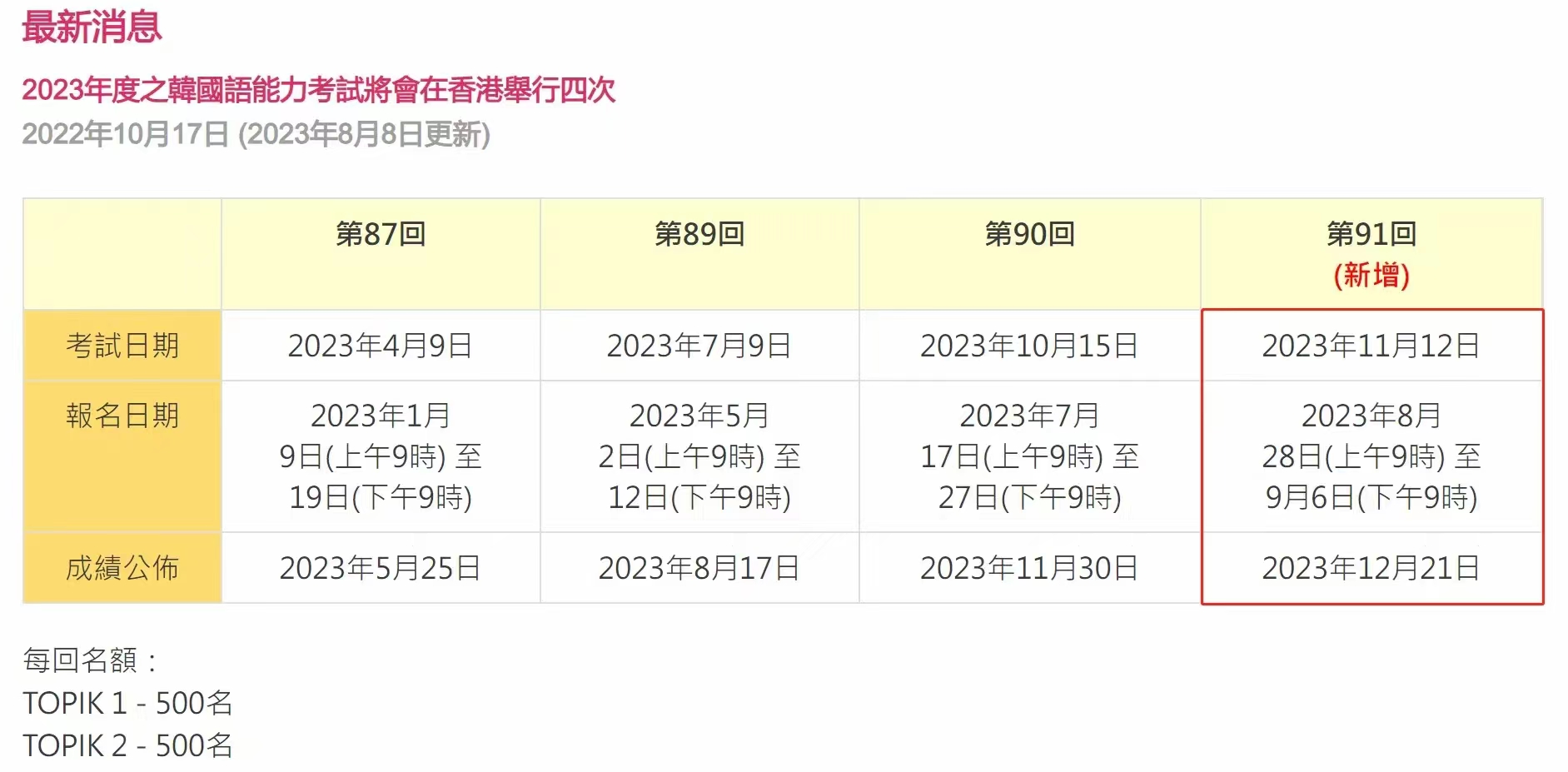第90届TOPIK没能抢到考位的同学,如果急着要证书的话,可以报考11月12日中国香港举办的第91届考试。报名时间:8 28 9:00-9 6 21:00考试