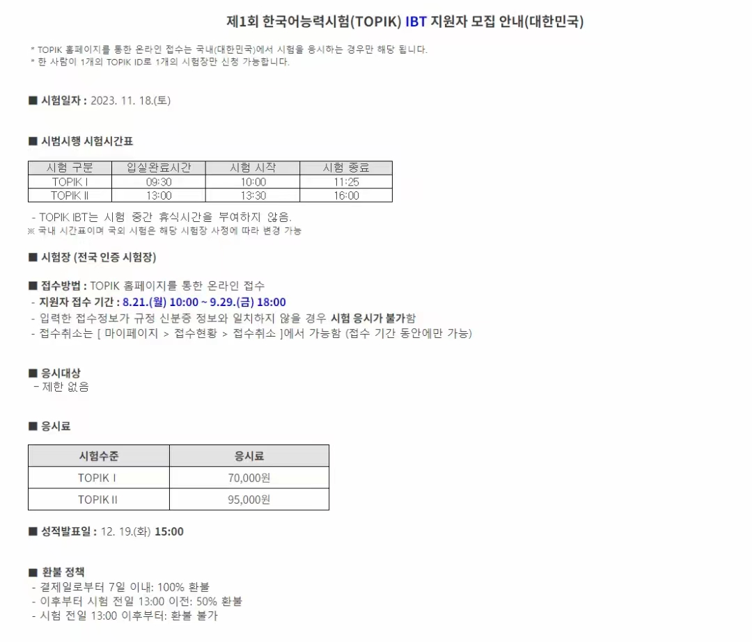 · 考试日期: 2023 11 18(周六) TOPIKⅠ:10:00~11:25 TOPIKⅡ:13:30~16: