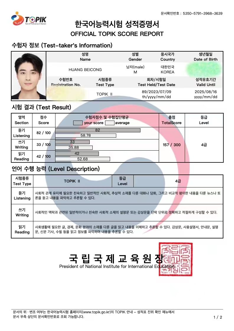 恭喜外言社黄同学顺利通过TOPIK四级!