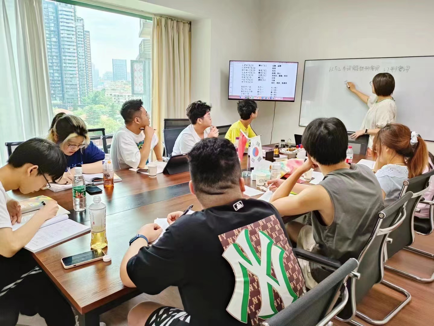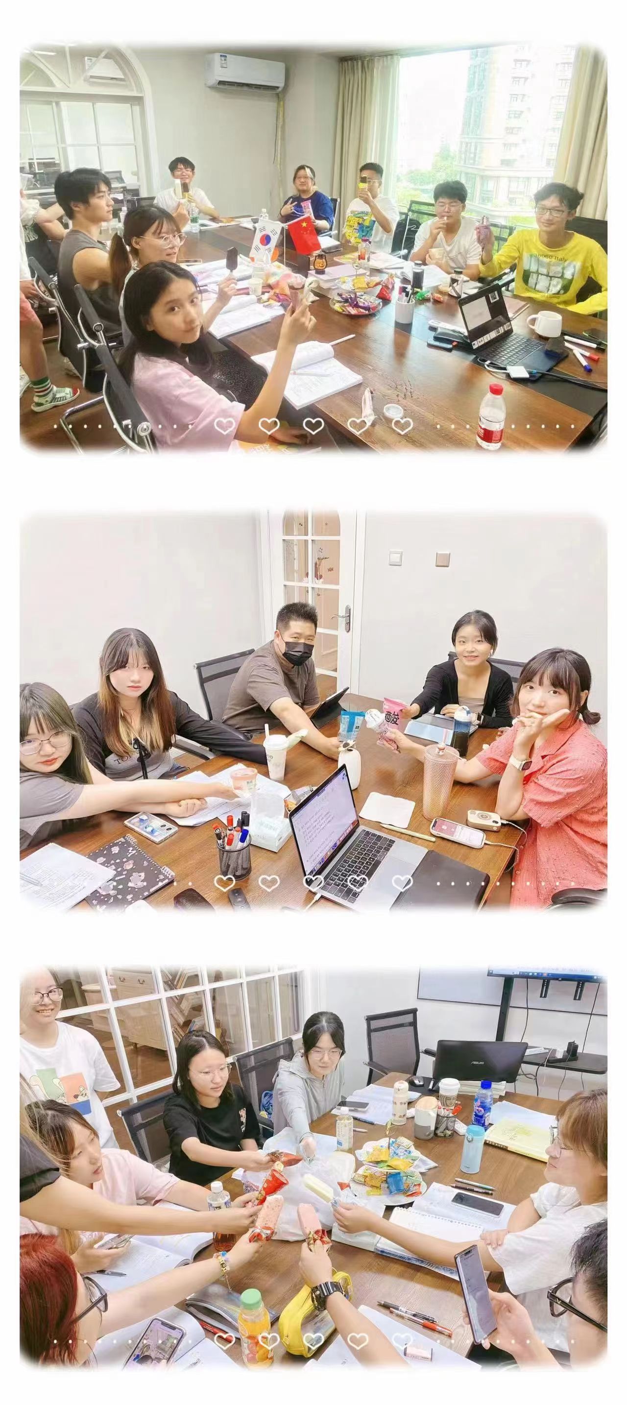 在阳光洒满的外言社教室一起学日韩语句型,在雨后的傍晚一起喝一杯小酒,在空调屋里抱着西瓜、拿着雪糕一起看一部电影;在晴朗的午后坐在球