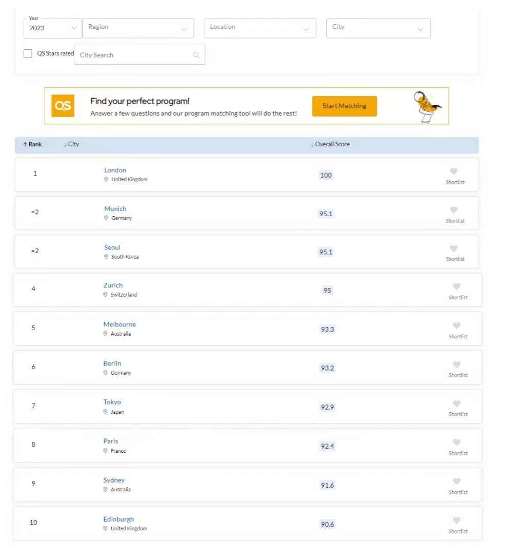 QS全球最佳留学城市排名