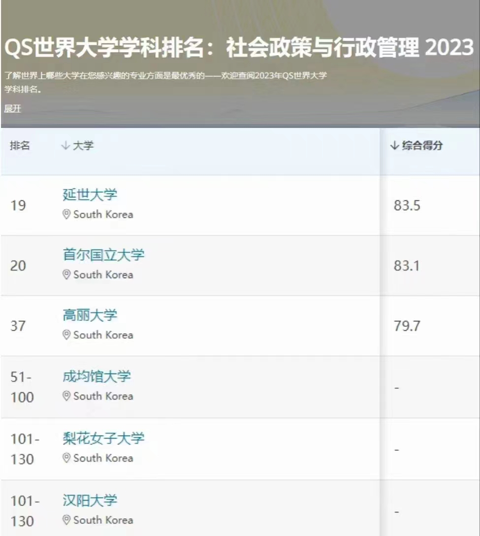 【韩国留学】2023QS世界大学学科排名社会政策与行政管理