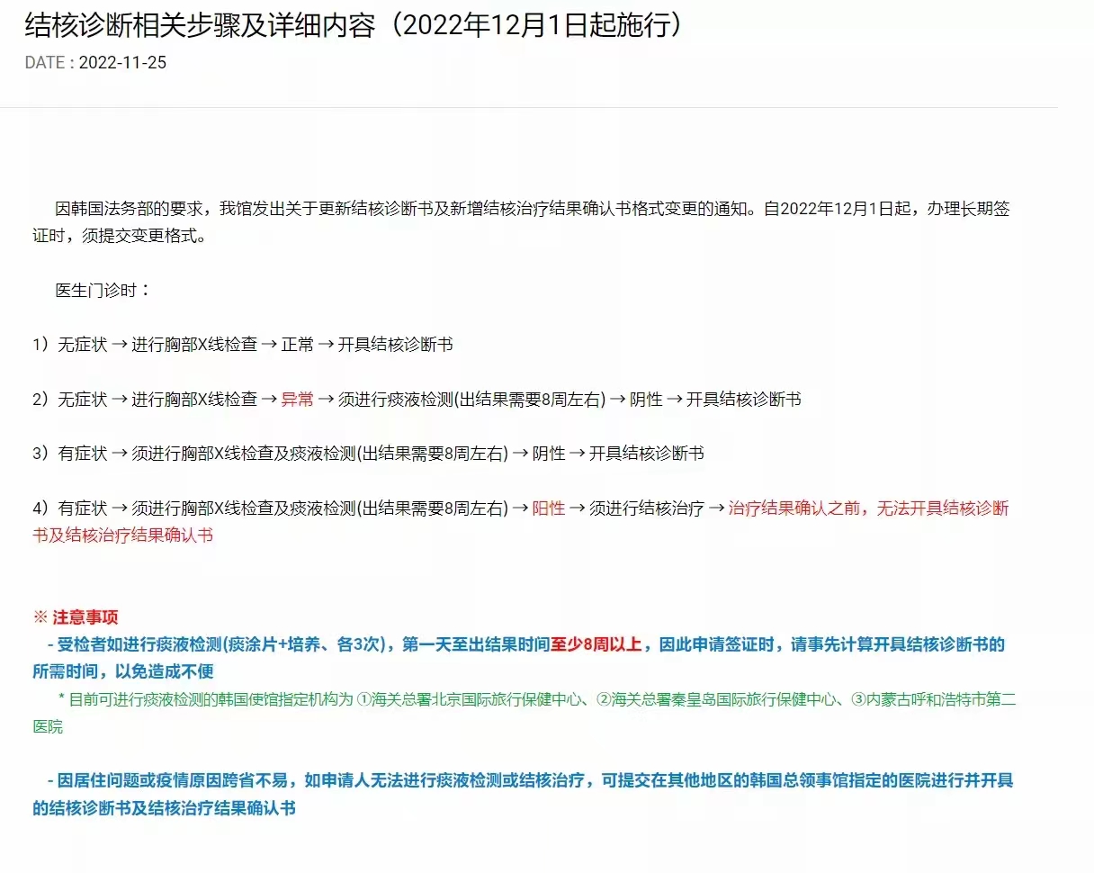 韩国留学签证结核诊格式更新,自2022年12月1日起,办理长期签证时,须提交变更格式。