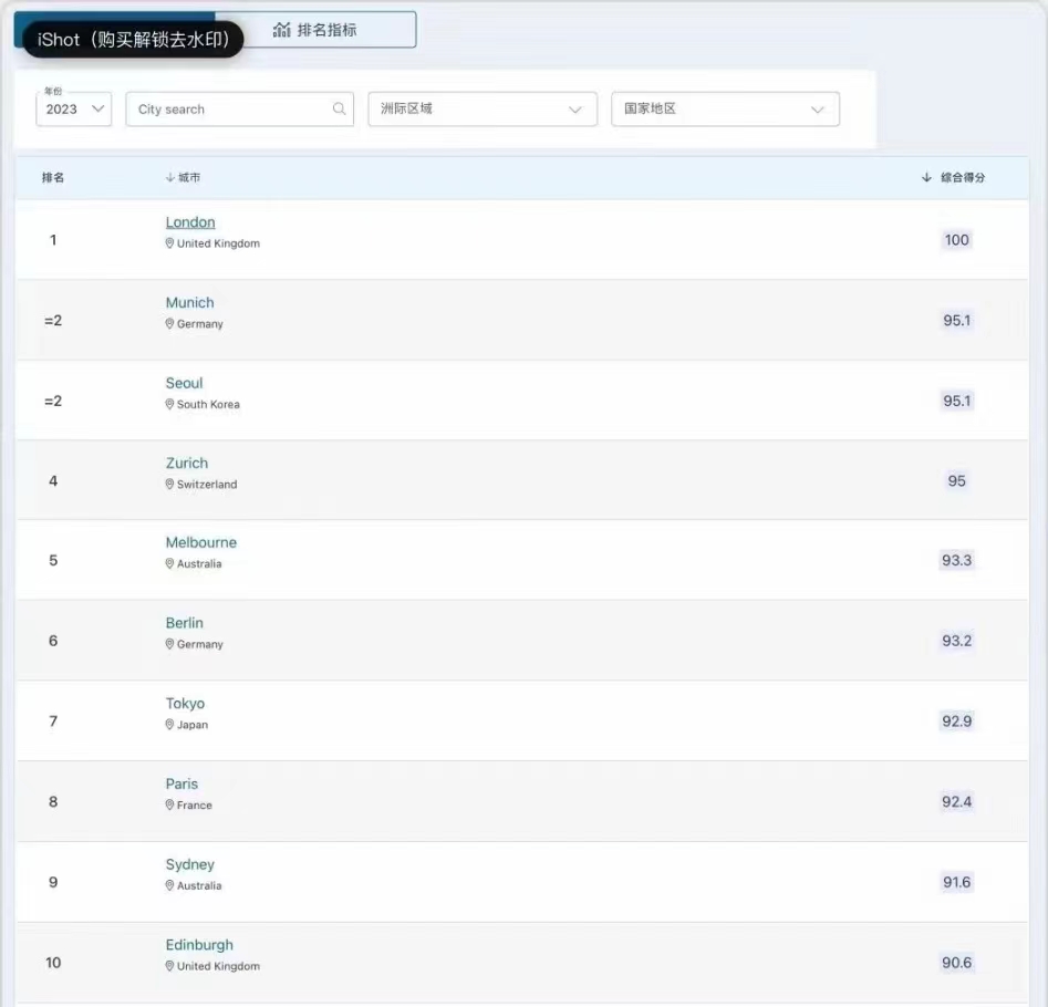 2023年QS最佳留学城市前十位:1、伦敦=2、慕尼黑=2、首尔4、苏黎世5、墨尔本6、柏林7、东京8、巴黎9、悉尼10、爱丁堡其中我们熟悉的城市中