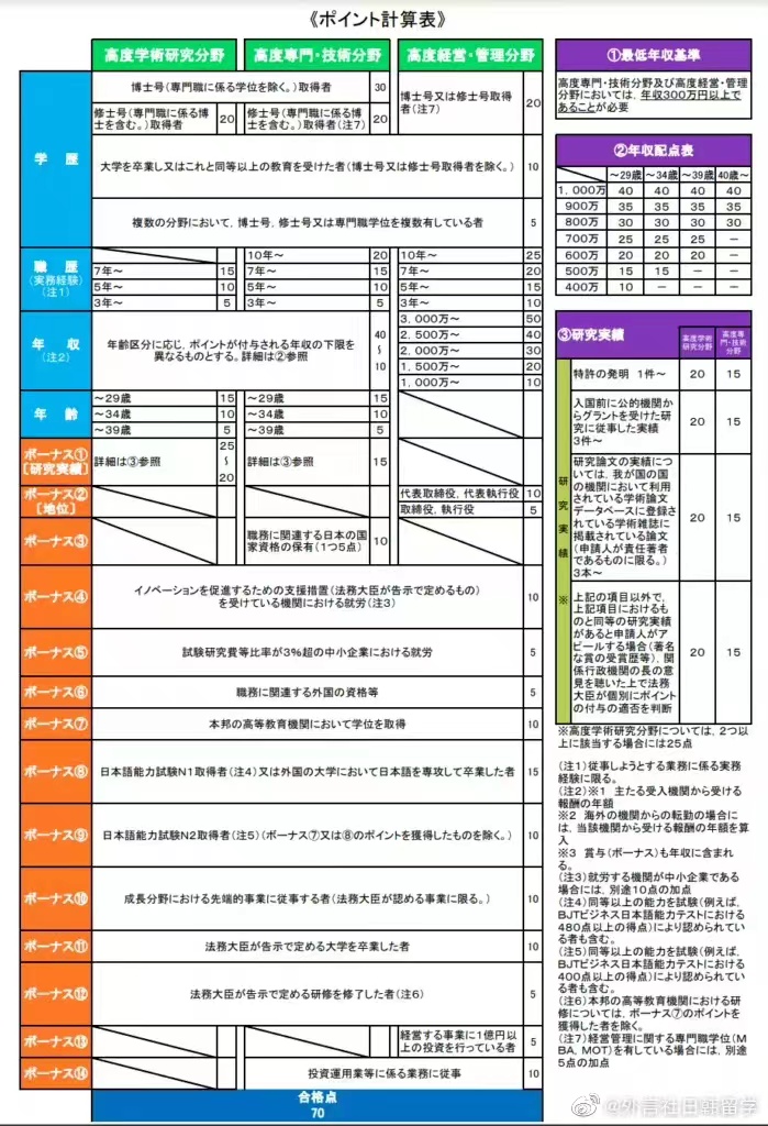 日本将于2022年内修改高度人才积分制,以降低获得永住权的门槛,以吸纳更多的外国人才。将收入、学历、工作经验等项目换算成分数,积分达到