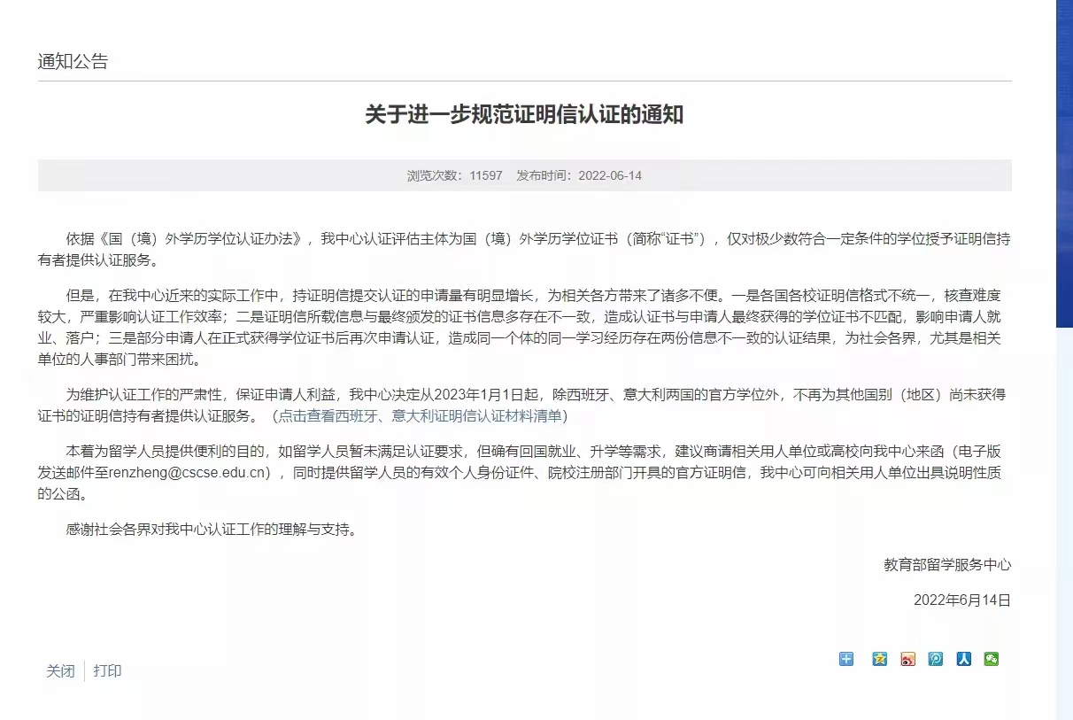 6 月 14 日,教育部留学服务中心发布了最新的海外学历认证规范通知。通知中明确表示:从2023年1月1日起,除西班牙、意大利两国的官方学