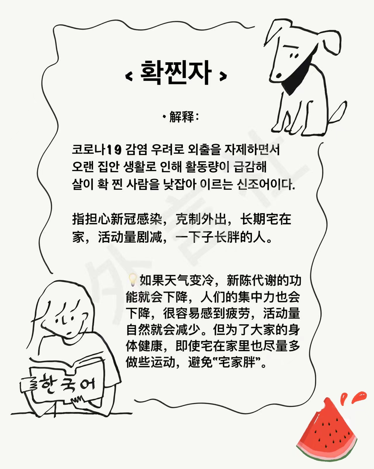 宅家太久长期又不运动的话,容易突然一下就长胖,这在韩语中被称为「확찐자」。为了大家的身体健康,每天一定要坚持适量运动,避免宅家胖哦~