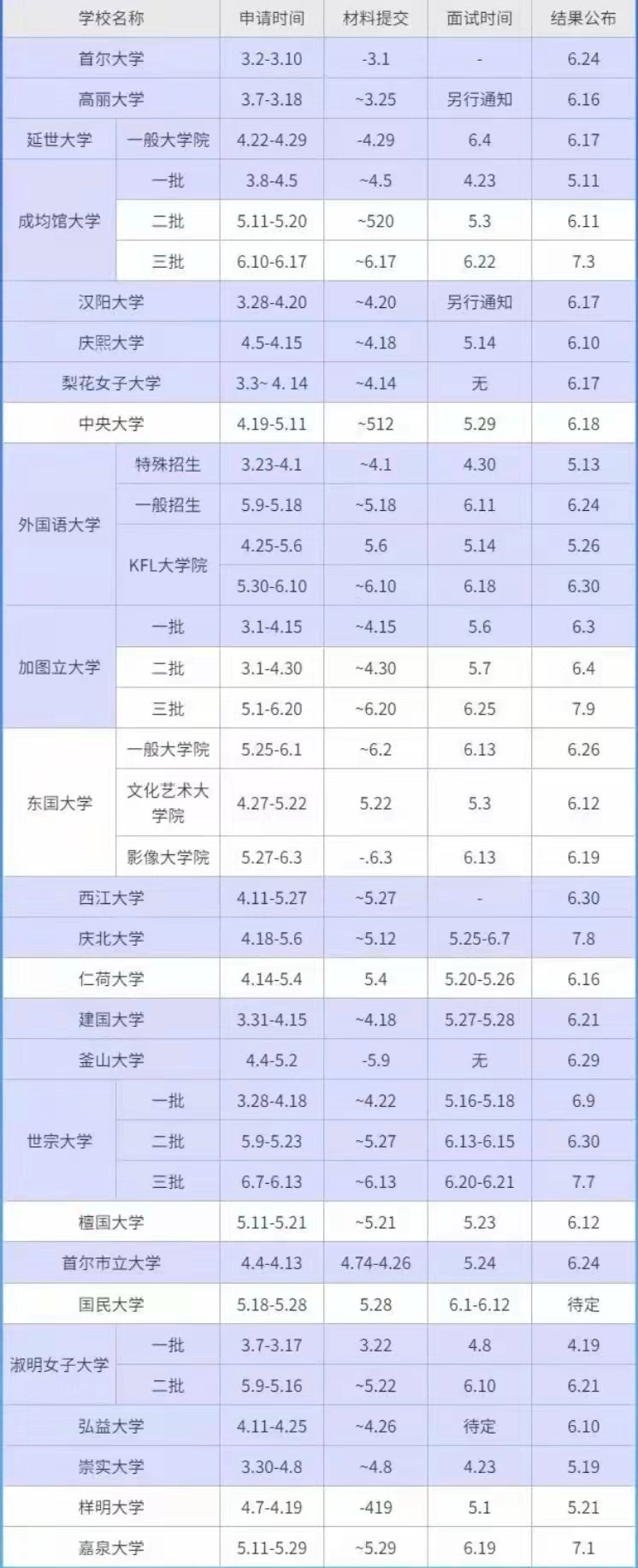四月即将截止申请的学校有:延世大学、汉阳大学、庆熙大学、梨花大学、加图立大学、建国大学、世宗大学、弘益大学