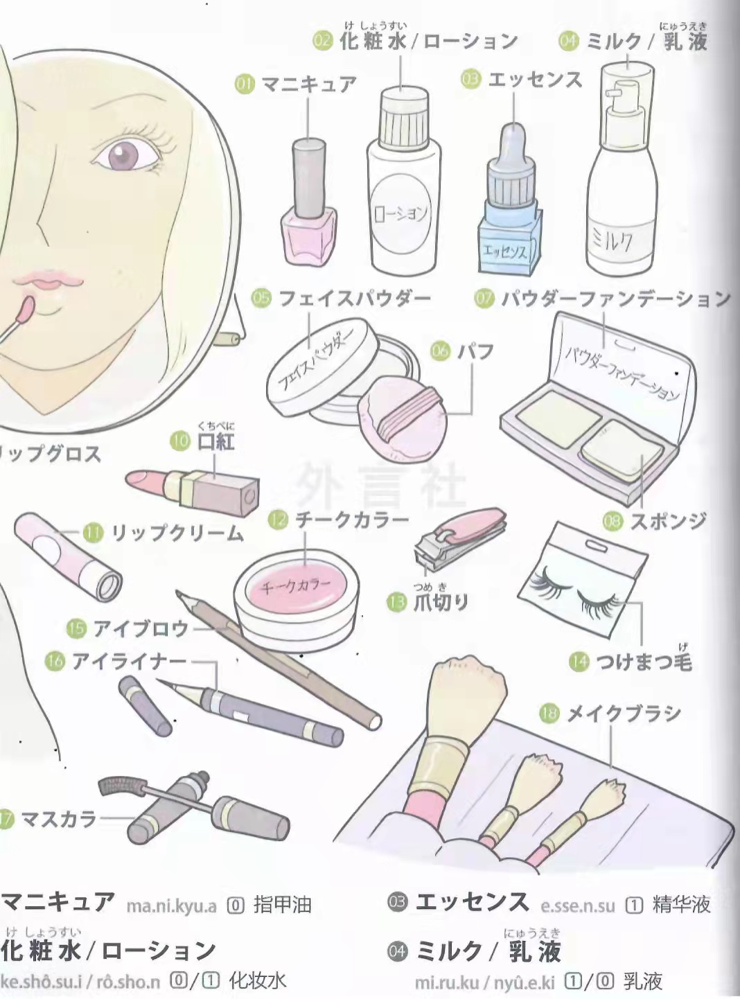 新年走亲访友当然要打扮的漂漂亮亮哒!不仅要穿新衣服,还要安排上美美的妆容。你知道用的这些化妆品用日语应该怎么说吗?一起来学习一下吧~