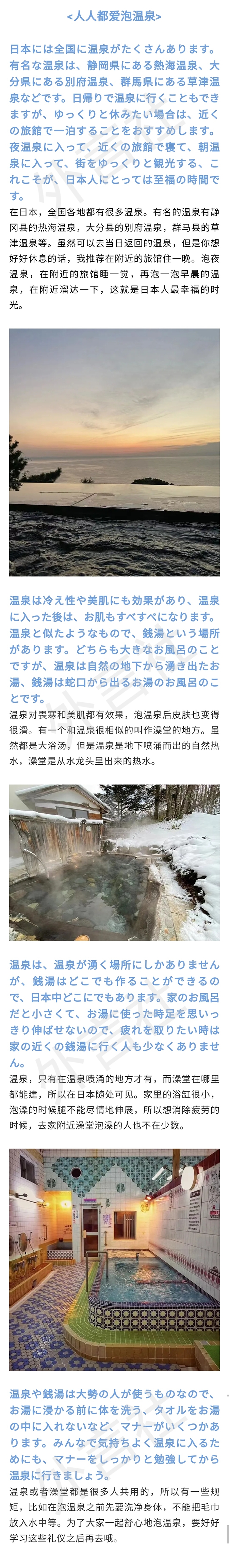 大家喜欢泡温泉吗? 在日本,全国各地都有很多温泉,有名的温泉有热海温泉、别府温泉、草津温泉等。在日本泡温泉的时候有哪些需要注意的温